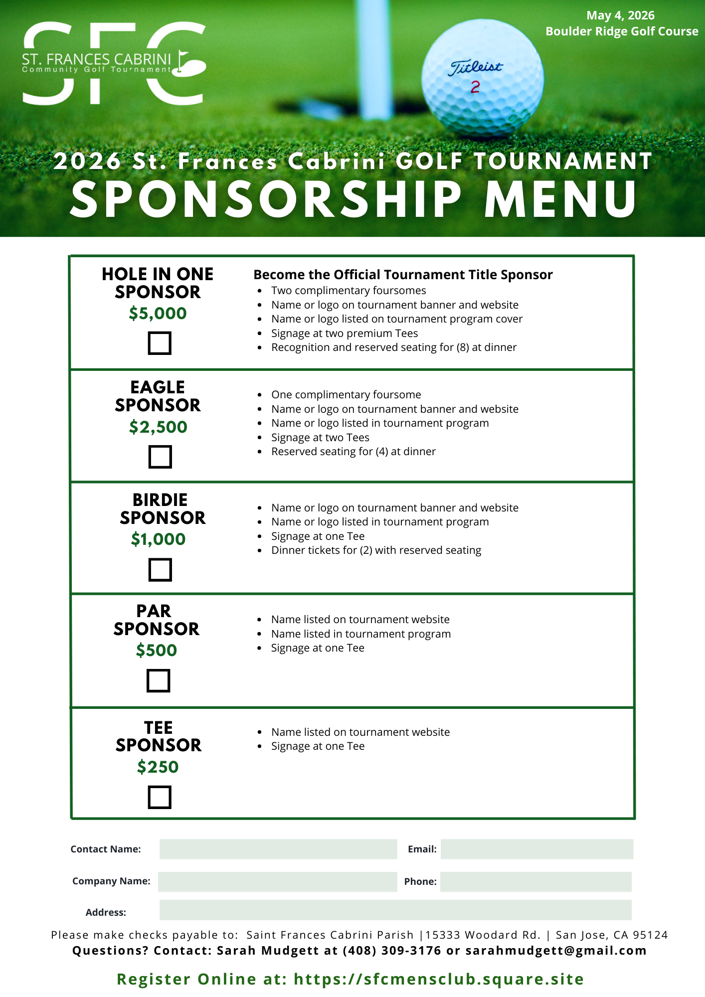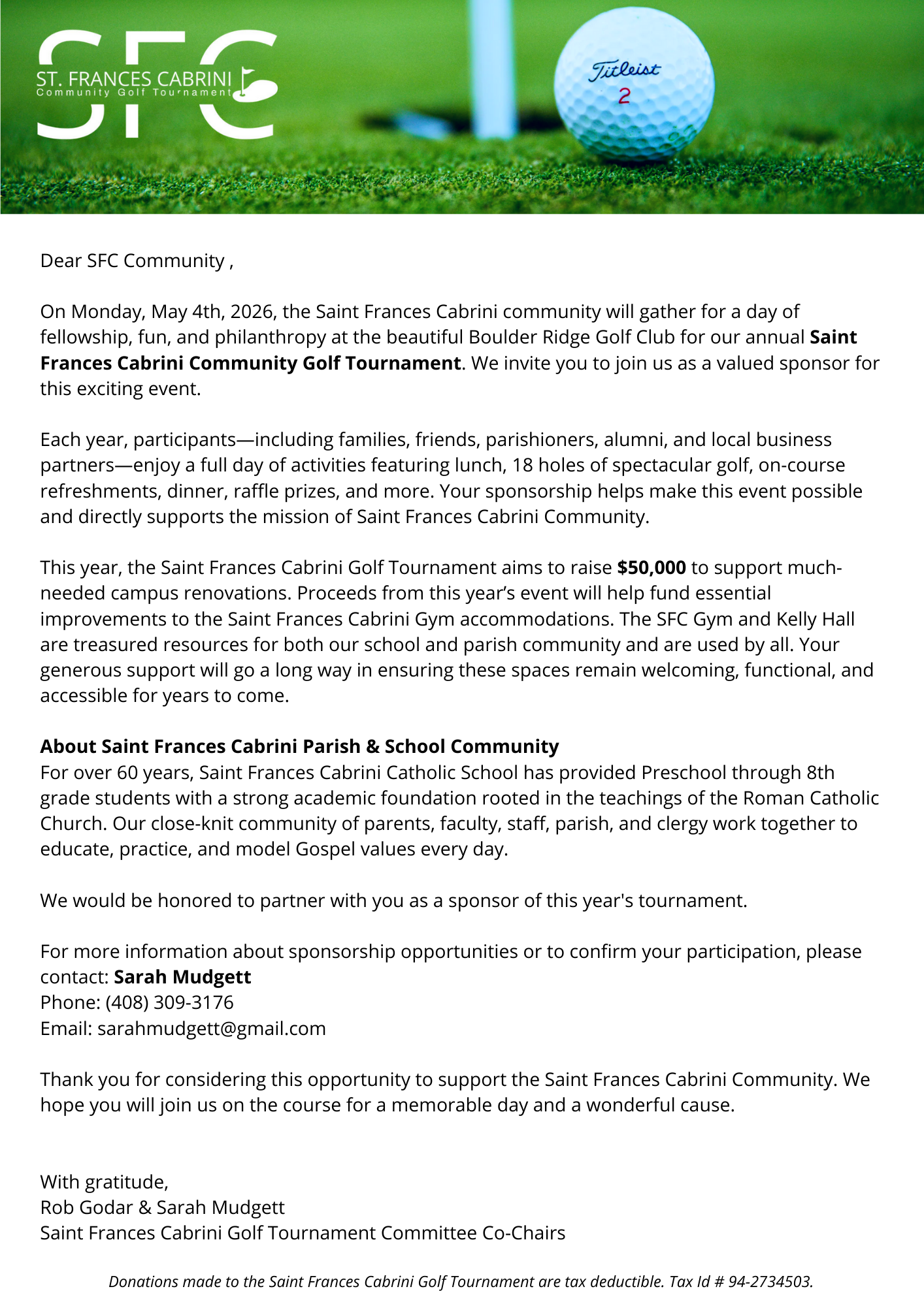 Thank you for sponsoring the SFC Golf tournament! Your donation will go towards campus improvements, specifically updating the gym facilities that are used by both the parish and the school. Our goal is to raise $50,000 and your donation helps get towards that goal! Please sign up using this link: https://forms.gle/W93S7eXH6ddBs55B6